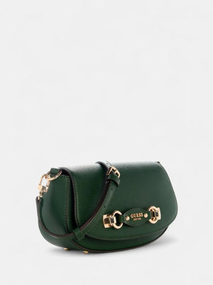 Complete your look with the green MIMINA crossbody bag, a chic accessory designed for style and practicality. Featuring a structured flap closure, an adjustable strap for versatile wear, and shiny gold hardware, this bag is crafted from a durable eco pebble PU base with matching self trim for a refined finish. Perfect for both day and night outings.