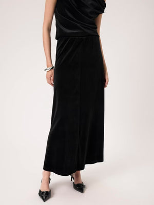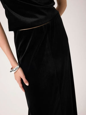 The VELERA skirt is a sophisticated choice for any elegant wardrobe. Crafted from rich black velvet, its A-line maxi silhouette offers a graceful drape that flatters every figure. This skirt combines timeless luxury with refined comfort, making it ideal for both formal events and polished everyday looks. Elevate your style effortlessly with this versatile statement piece.