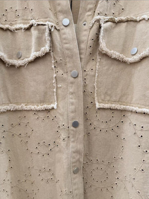 The ZOE Shirt combines effortless elegance with contemporary edge. Crafted in beige denim, this relaxed-fit piece features striking laser-cut detailing that adds visual interest and modern sophistication. Perfect for layering or wearing solo, it transitions seamlessly from casual weekends to refined evenings. The generous cut ensures comfort without compromising on style, making it an essential addition to any versatile wardrobe.