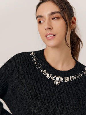 Add a touch of glamour to your basics with this soft knit jumper featuring delicate rhinestone embroidery on the collar.  Perfect for elevating a simple outfit, this jumper pairs perfectly jeans, trousers or skirts.  Its classic design makes suitable for work or play, while the soft knit ensures you stay warm and stylish all season long