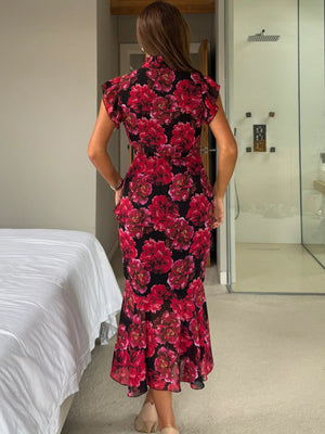 Meet HANNAH! This dress is the epitome of statement dressing! Crafted in a bold pink print and decorated with elegant frills around the neck and arms, this dress is a perfect addition to your wardrobe. The asymmetrical skirt and deep frill along the hem adds a touch of femininity to an otherwise simple silhouette. Pair with flats or heels for the perfect day to night dress.