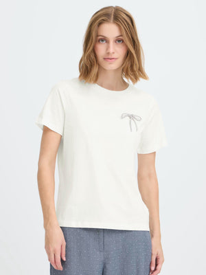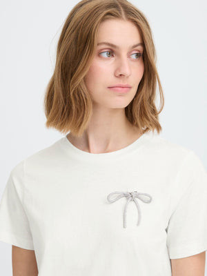 The KAMILLE t-shirt features a jersey fabric enhanced by a sparkling diamante bow, offering a refined blend of simplicity and elegance. Crafted to elevate your casual wardrobe, this t-shirt balances understated style with a touch of glamour, making it an ideal choice for those who appreciate subtle yet sophisticated detailing.