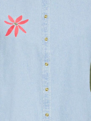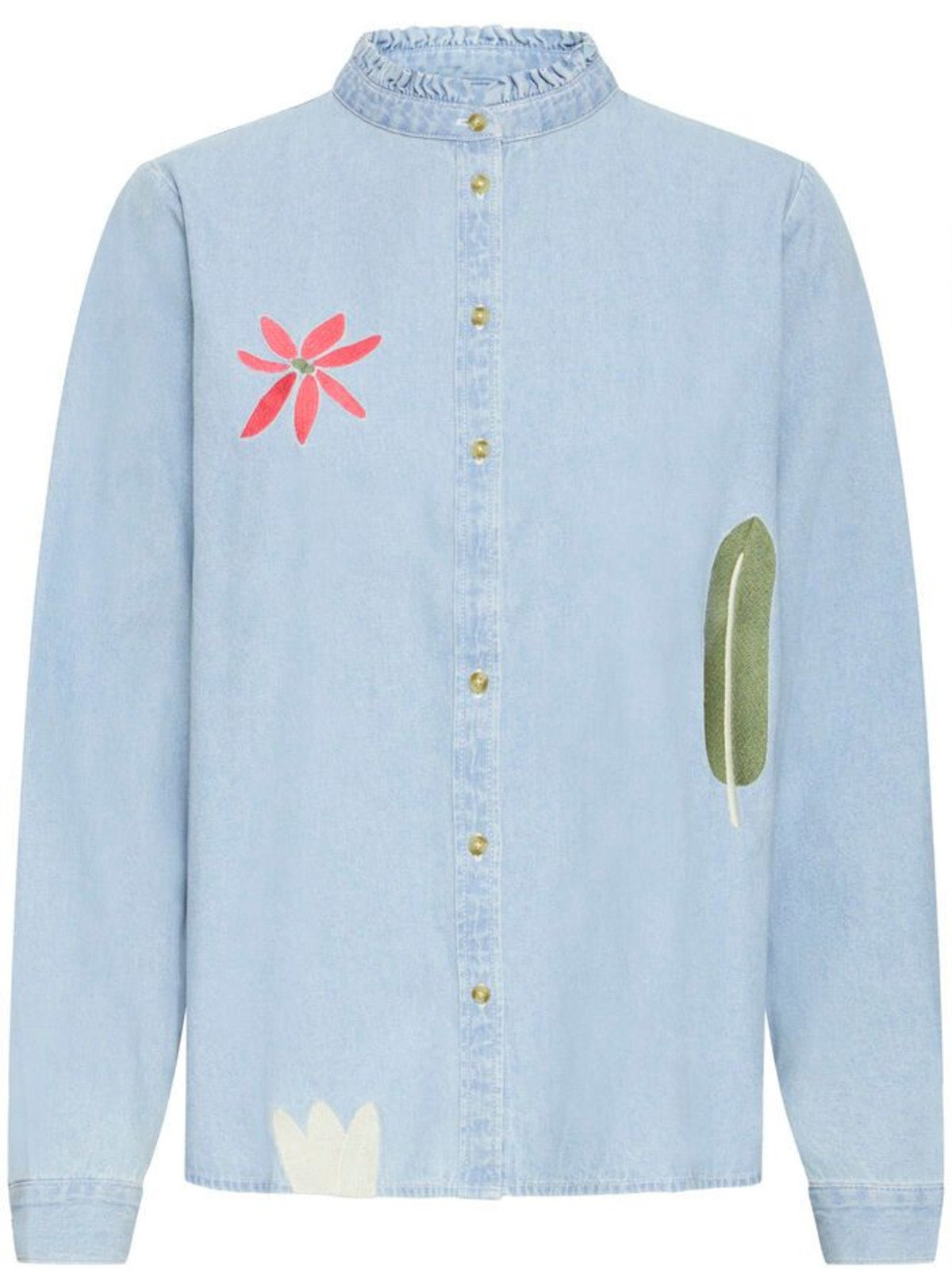 Add a playful twist to your everyday denim with this beautifully detailed ICHI Studio shirt. Crafted in a soft, lightweight chambray, this button-through blouse features a relaxed fit with a subtle ruffle neckline for a feminine finish.The standout embroidered appliqué details — a bold red floral design and contrasting leaf motif — give this classic denim piece a modern, artistic edge. Finished with natural-toned buttons and long sleeves, it’s perfect for effortless styling.Pair with white jeans for a fresh daytime look or layer over tailored trousers for an easy smart-casual outfit. A unique statement piece that blends comfort with contemporary charm.