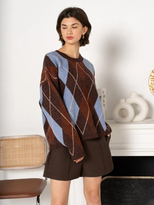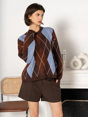 The Angela Jumper combines timeless style with eye-catching detail. This rich brown knit features a striking pale blue diamond print that adds visual interest without overwhelming your look. Perfect for layering or wearing solo, it's a versatile piece that effortlessly elevates casual outfits and works beautifully with both neutral and bold bottoms. Cosy, sophisticated, and undeniably wearable—a wardrobe essential that delivers on both comfort and style.