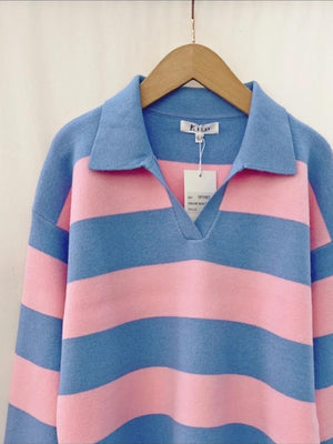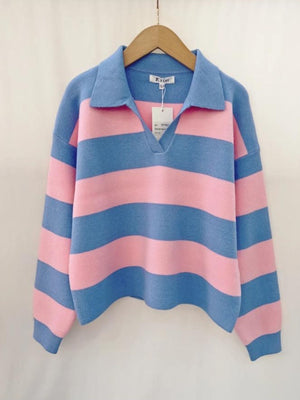 The NICKI Jumper is your new go-to for effortless style. Featuring soft pale blue and pale pink stripes in a classic polo design, this cosy knit brings a cheerful pop of colour to any outfit. Perfect for layering or wearing solo, it's the kind of piece that works just as well at the weekend as it does dressed up for something special. Comfortable, versatile, and undeniably charming—your wardrobe just got a whole lot more fun.