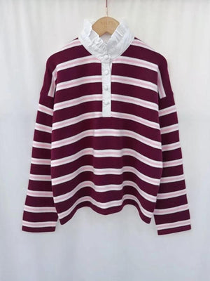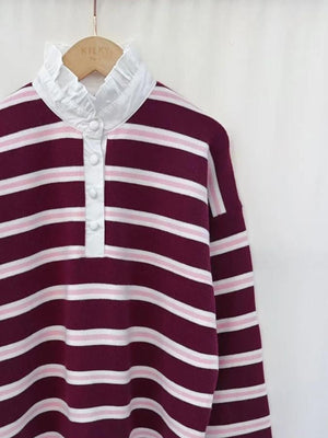 The PAMELA jumper is your new go-to for effortless style with a playful twist. Featuring bold burgundy and pink stripes that pop, this cosy piece brings instant personality to any outfit. The partial button-down front adds a touch of versatility—wear it buttoned for a polished look or leave it open for relaxed vibes. A charming frilled neck detail elevates the whole piece, making it perfect for those days when you want to feel a little extra fabulous without trying too hard.