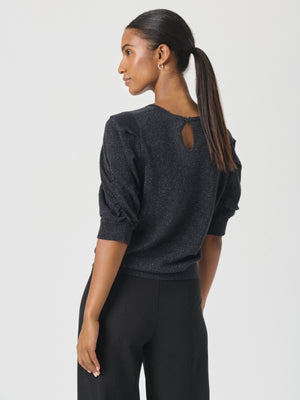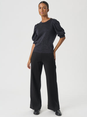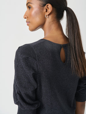 This dark navy jumper features a subtle shimmering surface for a sophisticated look. With short puff sleeves and a round neckline, it combines simplicity and femininity. Perfect for elevating an everyday outfit or as an elegant top for an evening with style.
