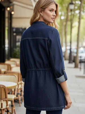 The DAVINA Jacket combines timeless denim styling with contemporary design details. This mid-length piece features adjustable drawstring toggles at the waist, allowing you to refine the silhouette to suit your preference. Crafted from classic denim, it layers effortlessly over your everyday wardrobe whilst maintaining an elevated aesthetic. Perfect for transitional seasons, the Davina offers versatile sophistication for both casual and smart-casual occasions.