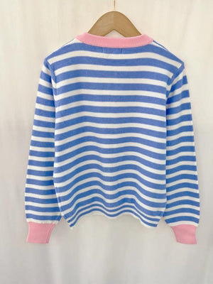 Introducing the ERIN Cardigan – a cheerful layering essential that brings instant personality to any outfit. This charming blue and white striped design features delightful pink trim framing the collar and cuffs, creating a fun colour-pop detail that catches the eye. Perfect for throwing over your favourite tee or dress, it's the kind of piece that makes getting dressed feel like play. Cosy, versatile, and undeniably cute, the ERIN is ready to become your go-to cardigan for effortless style.