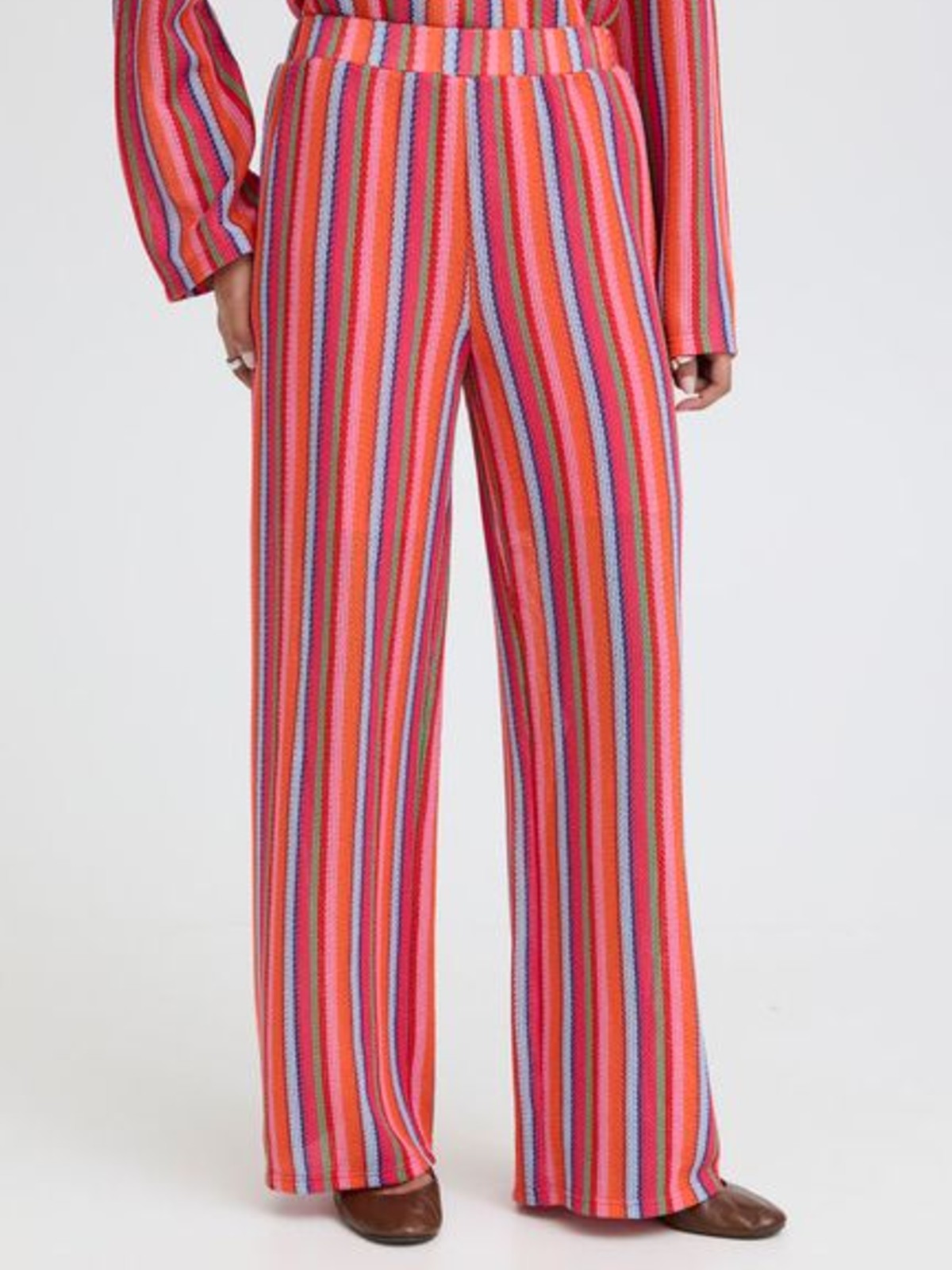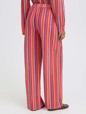 Make a statement in these eye-catching multi-stripe trousers, designed to bring effortless colour and movement to your wardrobe. Featuring a flattering high-rise elasticated waistband, they offer a comfortable, pull-on fit that sits neatly at the waist while creating a beautifully elongated silhouette. The bold vertical stripe pattern in rich pinks, reds and contrasting tones enhances the wide-leg shape, giving a leg-lengthening effect and an easy, flowing finish. Crafted from a lightweight fabric, they drape softly and move gracefully with every step.