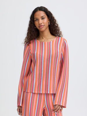 Add a playful pop of colour to your everyday wardrobe with this vibrant striped long sleeve top. Designed in a soft, comfortable stretch fabric, it features a flattering straight fit with a classic round neckline and gently flared cuffs for a subtle statement finish. The vertical stripe pattern in shades of pink, coral and soft blue creates a fresh, eye-catching look while elongating the silhouette. Easy to dress up or down, it pairs perfectly with the matching trousers for a coordinated set or styled with denim for a relaxed yet polished outfit. A versatile piece that brings effortless charm and modern femininity to any look.