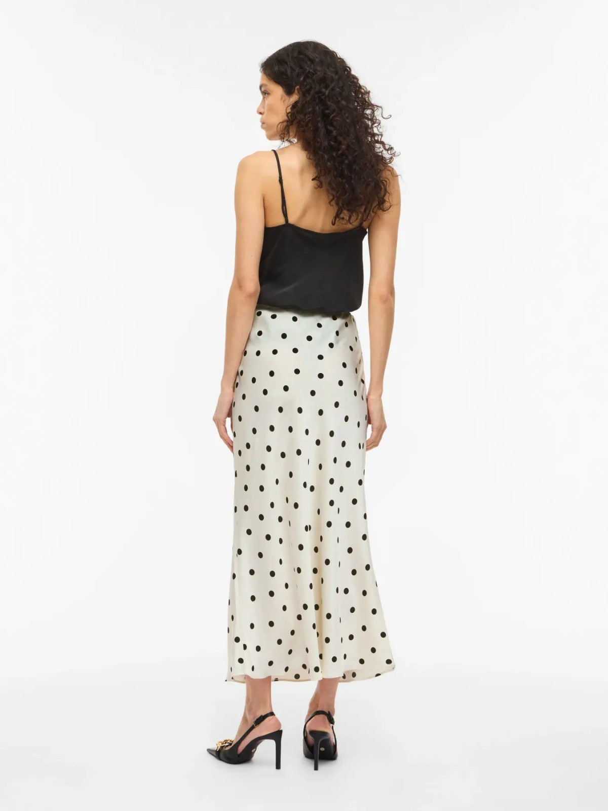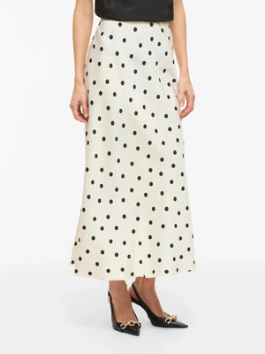 Elevate your wardrobe with this stunning cream satin maxi skirt, adorned with charming black polka dots. The luxurious satin fabric drapes beautifully, creating an elegant silhouette perfect for special occasions or sophisticated everyday wear. The timeless polka dot pattern adds a playful touch to this classic piece, making it versatile enough to style with everything from casual tops to formal blouses. Comfortable and chic, this maxi skirt is a must-have addition to any fashion-forward collection.
