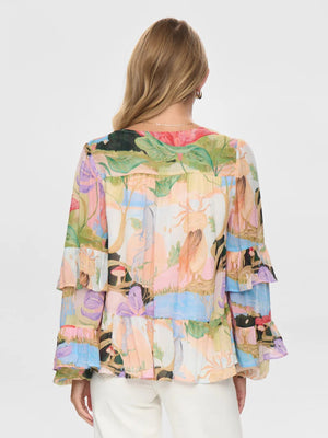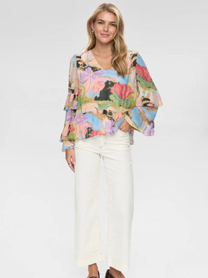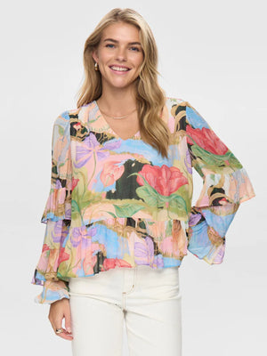 Light, romantic, and full of colour, the Nushailyn Blouse is a standout piece for effortless styling. Designed in a sheer, airy fabric with a soft pastel floral print, it features a relaxed silhouette with a flattering V-neckline and layered ruffle detailing through the body and sleeves. The floaty finish and gentle drape add movement and femininity, making it perfect for both everyday wear and special occasions. Style with denim or crisp white trousers for a fresh, elegant look