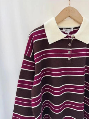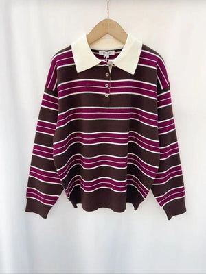 Meet your new go-to jumper! The COLEEN Striped Jumper pairs playful purple and brown stripes with a classic polo cut that's anything but boring. Long sleeves keep you cosy while the fun colour combo adds instant personality to your look. Throw it on with jeans, dress it up with tailored trousers, or layer it over a tee—this striped beauty works harder than you'd think. Simple, stylish, and ready to become your favourite reach-for piece.