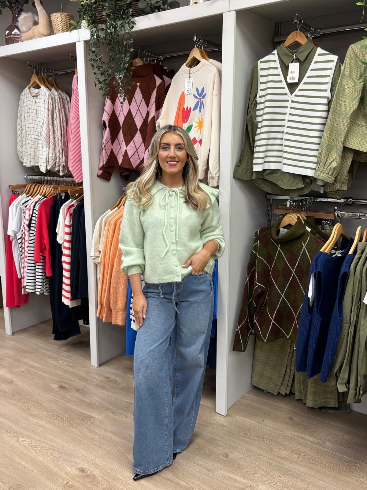 Elevate your everyday wardrobe with the Ella Cardigan, a sophisticated pale green piece that effortlessly transitions from office to weekend. This collared cardigan features a charming tie-top detail that adds a touch of elegance and allows you to customize your look. The soft, versatile shade pairs beautifully with neutrals or bolder tones, making it a wardrobe essential that works harder than most. Layer it over dresses, tees, or wear it standalone for a polished appearance that never goes out of style.