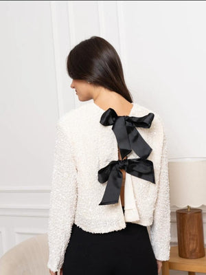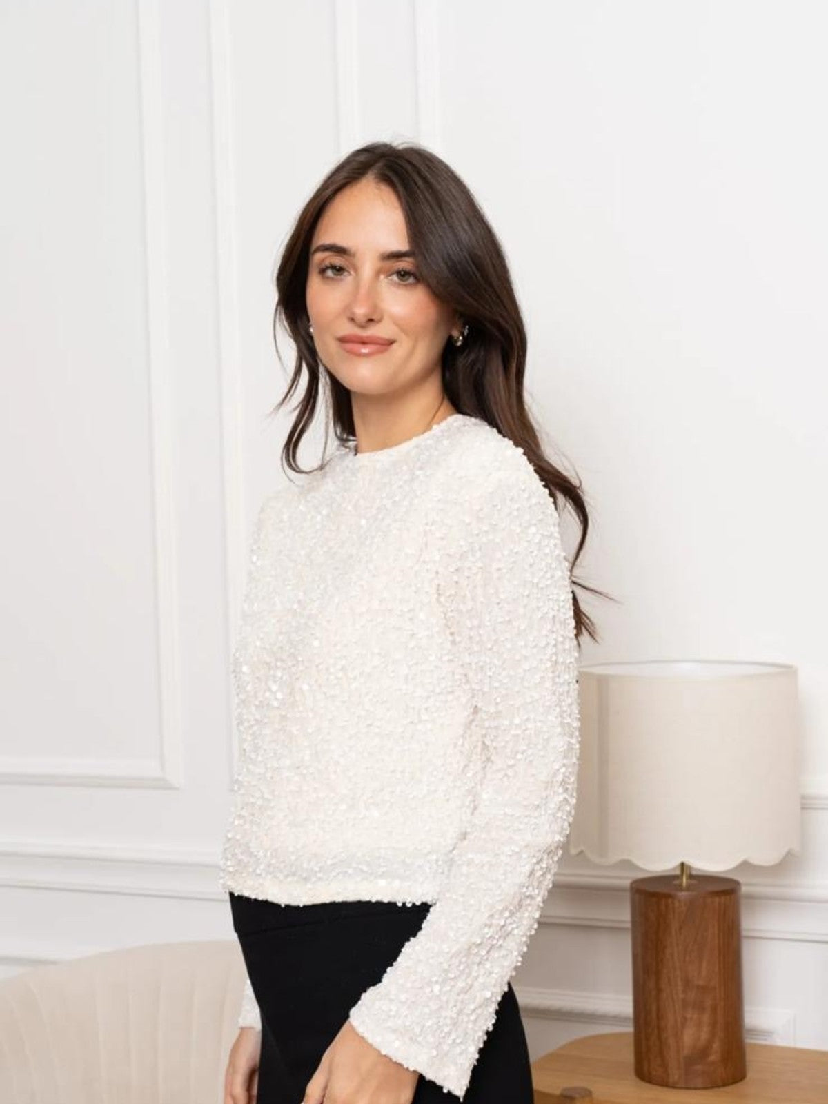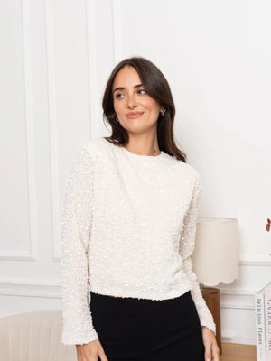 Get ready to sparkle and shine in the ZELDA cream top! This sequined long-sleeve beauty features a fun, self-tie bow closure that lets you add a cheeky twist to your look. Perfect for dancing the night away or simply turning heads wherever you go!