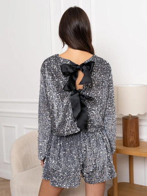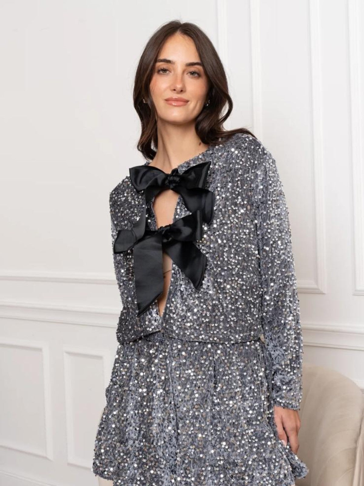 Get ready to sparkle and shine in the ZELDA silver top! This sequined long-sleeve beauty features a fun, self-tie bow closure that lets you add a cheeky twist to your look. Perfect for dancing the night away or simply turning heads wherever you go!