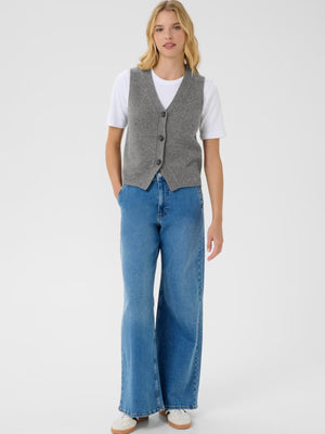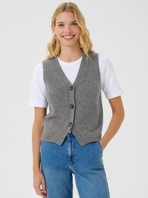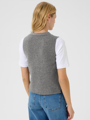 This soft grey wool knitted vest features a classic V-neck and three-button front. The ribbed hem adds a timeless touch. Wear it over a T-shirt or shirt for a casual yet polished layered look.