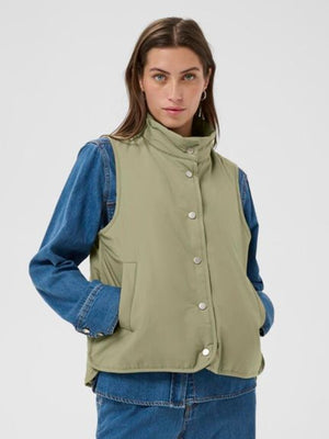 Stay effortlessly stylish and warm with this contemporary padded gilet in a soft sage/khaki tone. Designed with a high neckline for added comfort, this sleeveless layer features sleek silver popper fastenings and a smooth, lightweight finish that makes it perfect for transitional dressing.The relaxed fit allows for easy layering over knitwear or striped basics, while the practical front pockets add both function and a laid-back edge. Ideal for everyday wear, weekend outings, or casual office looks, this versatile gilet is a must-have staple for the cooler seasons.