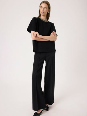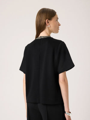 Elevate your everyday style with the MARIGOLD embellished tee. This black tee features exquisite neck embellishments that add a touch of elegance to a classic silhouette. Perfect for dressing up or down, it offers effortless sophistication and comfort in one versatile piece. Make a stunning statement with this uniquely detailed top.