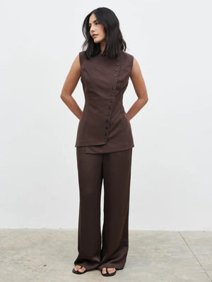 Elevate your occassionwear with this beautifully tailored sleeveless top, designed for a sleek and sophisticated silhouette. Crafted in a structured brown fabric, this elegant piece features a striking asymmetric row of contrasting black buttons that create a modern, eye-catching detail. The clean round neckline and fitted bodice contour the figure, while the subtle peplum-style hem adds soft shape and refinement. Perfect for weddings, formal events, or chic evening styling, this top pairs effortlessly with tailored trousers or a matching skirt for a polished, contemporary look. Timeless, flattering, and effortlessly refined — a statement piece for any elegant wardrobe.