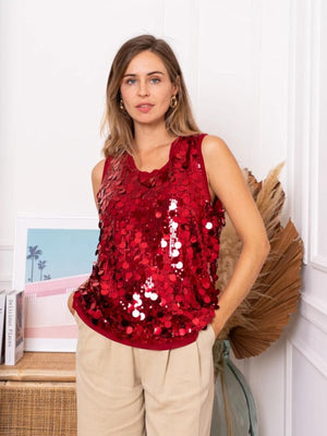 Elevate your evening look with the Eve Sequin Top, a stunning sleeveless design that catches the light from every angle. Crafted with vibrant red sequins, this piece delivers instant glamour and sophistication for nights out, parties, or special occasions. The sleek silhouette flatters your figure while the shimmering embellishment ensures you'll turn heads wherever you go. Perfect for layering or wearing solo, this versatile top transforms any outfit into something truly memorable. Make a statement and shine bright.