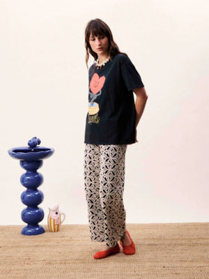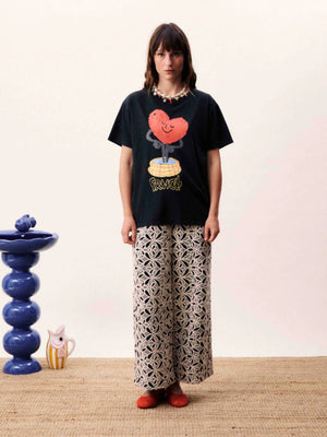 Make a playful statement with this standout graphic T-shirt, designed to bring personality and charm to your everyday wardrobe. Crafted in a classic black base, this tee features a bold and eye-catching front print that instantly draws attention. The central design showcases a whimsical heart character with a smiling face, standing proudly on a decorative pedestal, adding a fun and artistic touch to the look. Finished with logo-style lettering beneath the illustration, it gives the piece a creative, contemporary edge. Designed with a relaxed, easy fit, this T-shirt offers all-day comfort without compromising on style.