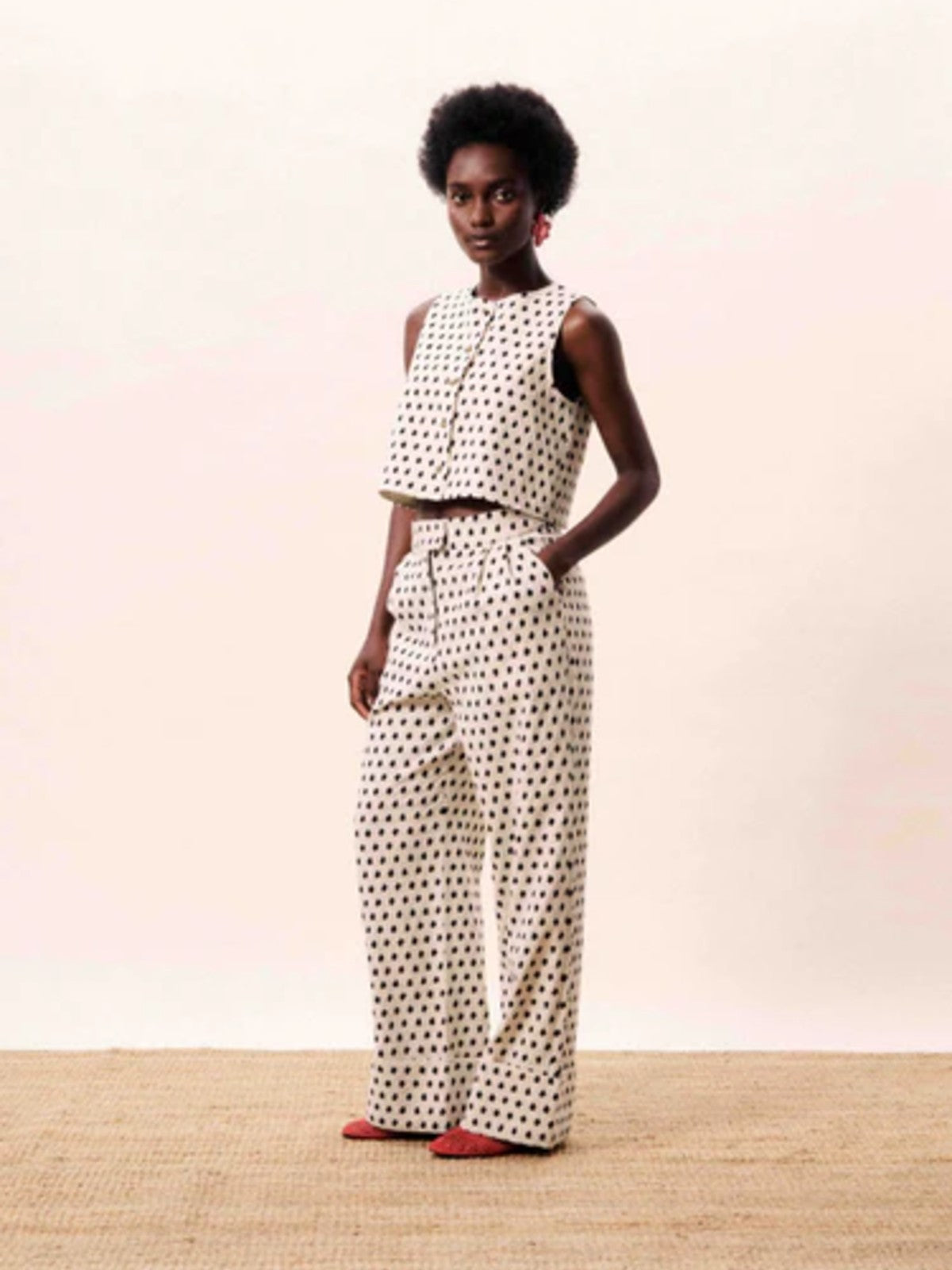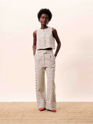 Chic, modern and effortlessly polished, this sleeveless printed vest is the perfect statement layering piece. Crafted in a lightweight fabric, it features a clean round neckline and a sleek button-through front for a tailored finish. The subtle all-over monochrome print adds texture and interest, while the cropped length creates a flattering silhouette that pairs beautifully with matching trousers or high-waisted separates. Wear it on its own for a contemporary co-ord look or layer over a fitted tee or blouse for versatile styling. Smart, sophisticated and easy to dress up or down, this vest is a standout addition to any wardrobe.