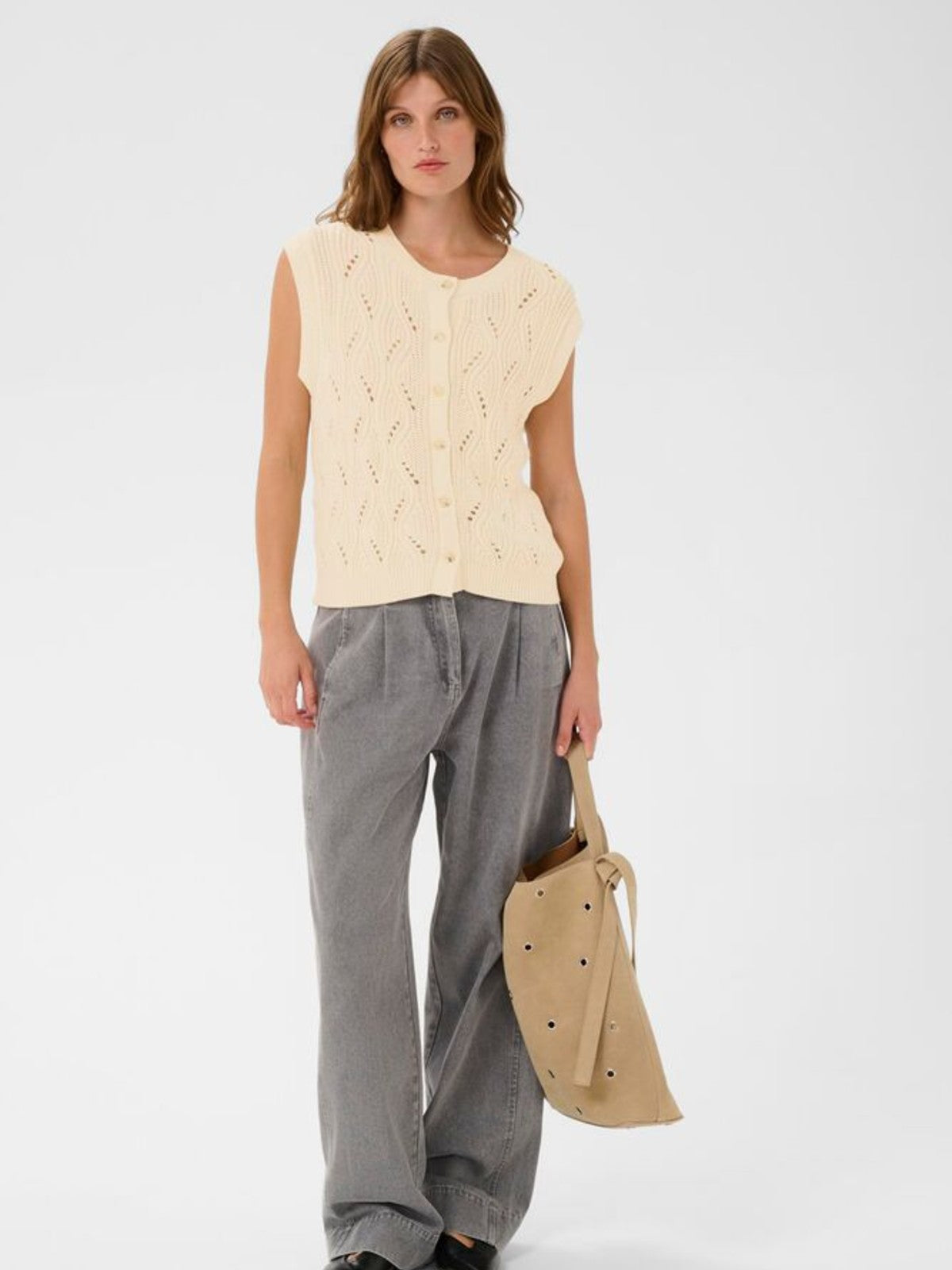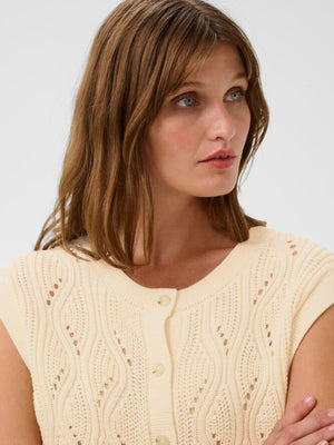 Elevate your everyday layering with the RAVA vest – a timeless knit designed with effortless elegance in mind. Crafted in a soft, lightweight fabric, this sleeveless waistcoat features a delicate pointelle pattern throughout, adding subtle texture and femininity to the clean silhouette. Designed with a classic round neckline and button-through front, it’s perfect worn on its own for a minimalist look or layered over a crisp shirt or tee for versatile styling. The relaxed fit and soft neutral tone make it an easy addition to your wardrobe, pairing beautifully with tailored trousers or casual denim. A chic transitional piece that blends comfort with understated sophistication.