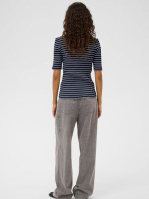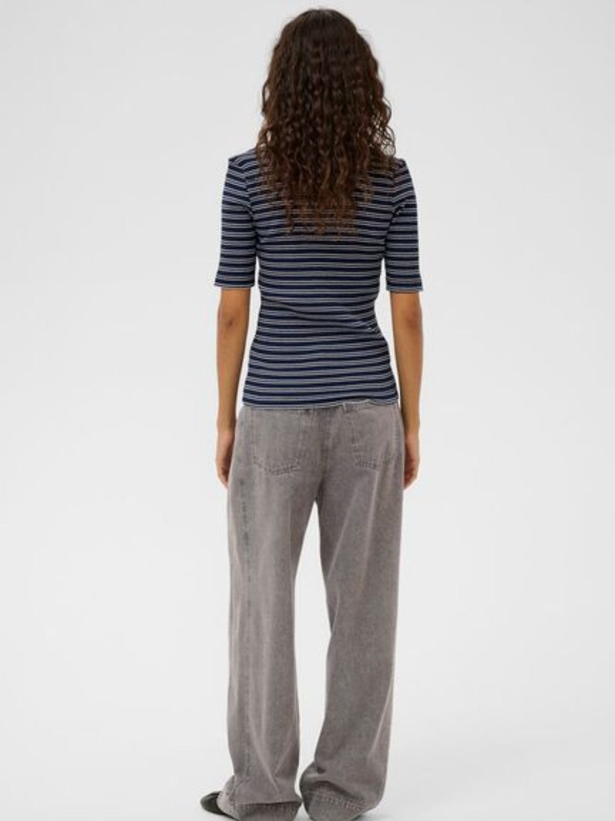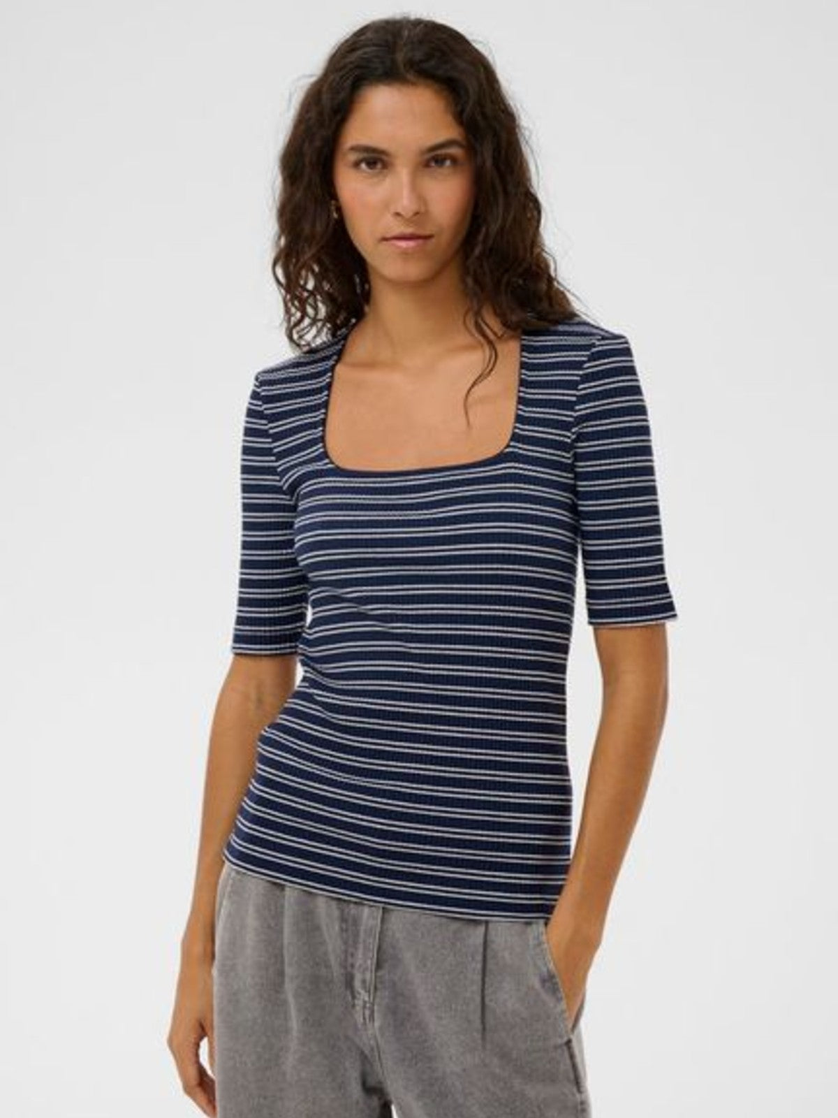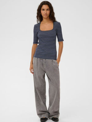 The Simone Tee combines understated elegance with everyday versatility. This navy square-necked design features crisp white stripes that add visual interest and dimension to a timeless silhouette. The structured neckline creates a refined, polished look suitable for both casual outings and layered styling. Crafted for comfort and durability, this tee transitions effortlessly from day to evening, making it an essential addition to any wardrobe.