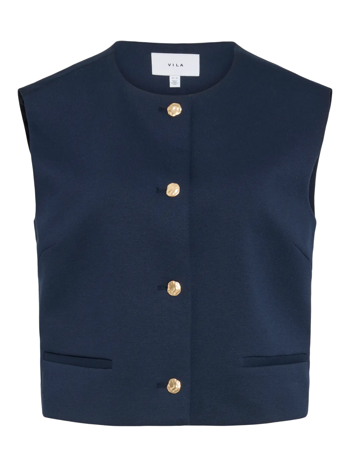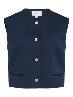 The TILDA Vest is your new go-to layering piece that works harder than it looks. This navy sleeveless wonder features four gleaming gold buttons down the front, adding just the right amount of polish to any outfit. Throw it over a crisp white shirt for office chic, or pair it with a tee for effortless weekend style. Versatile, timeless, and undeniably sharp—the Tilda is basically the friend who always knows what to wear.